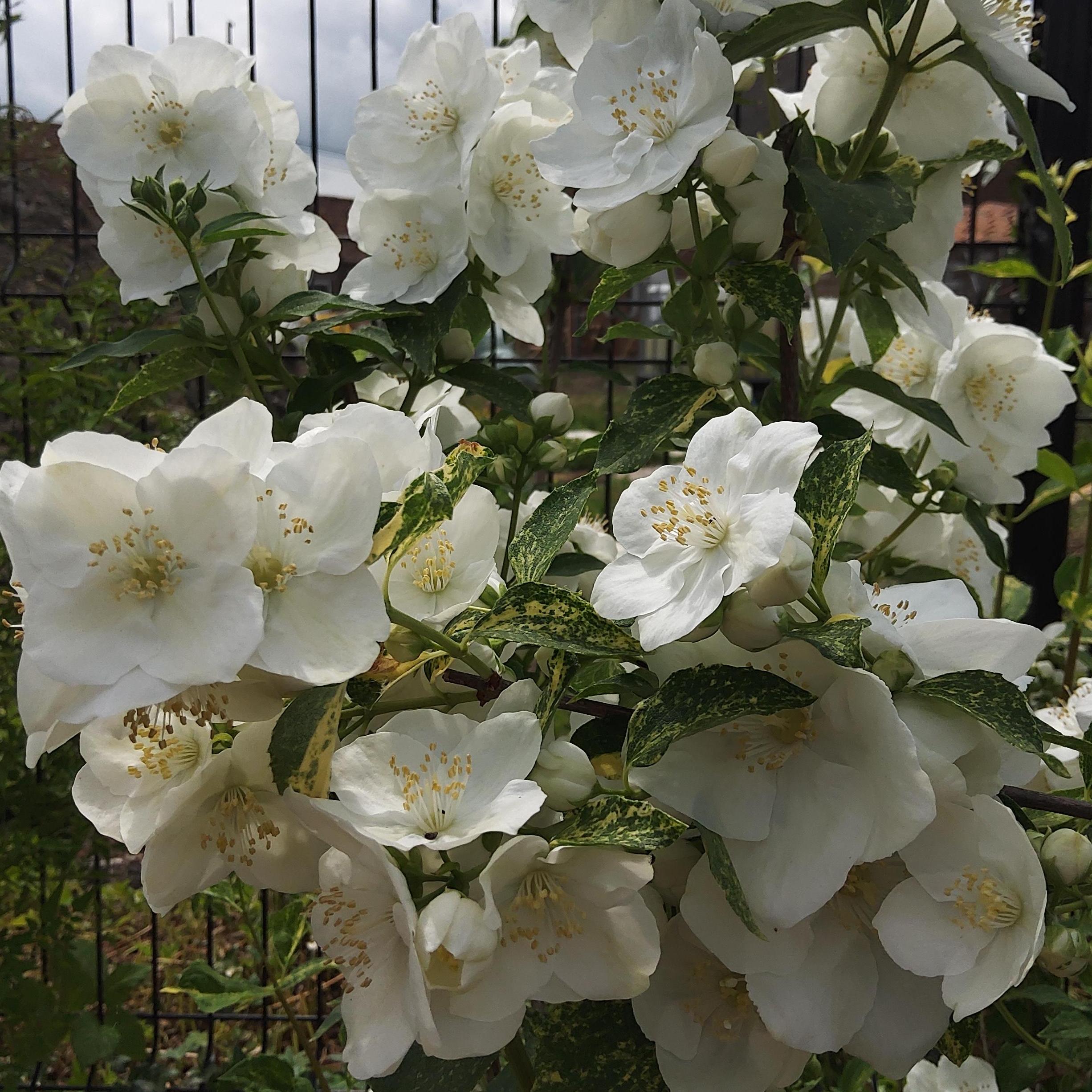 Le Philadelphus Innocence est une variété de seringat des jardins très ancienne, qui mérite peut-être plus que toute autre, en raison de son parfum inoubliable, le nom de Jasmin des poètes que l'on donne parfois à ces arbustes. 'Innocence' charme au printemps, par une abondance de grappes de fleurs blanches et odorantes, si simples et si légères, mais il séduit aussi en dehors de la floraison, par son feuillage aléatoirement éclaboussé de crème, de jaune et d'or. Un peu long à s'installer, ce seringat forme avec le temps un buisson bien dense, très solide, au port fluide et légèrement arqué. Son feuillage panaché qui craint la morsure du soleil habille avec beaucoup d'élégance les zones ombragées ou mi-ombragées du jardin.