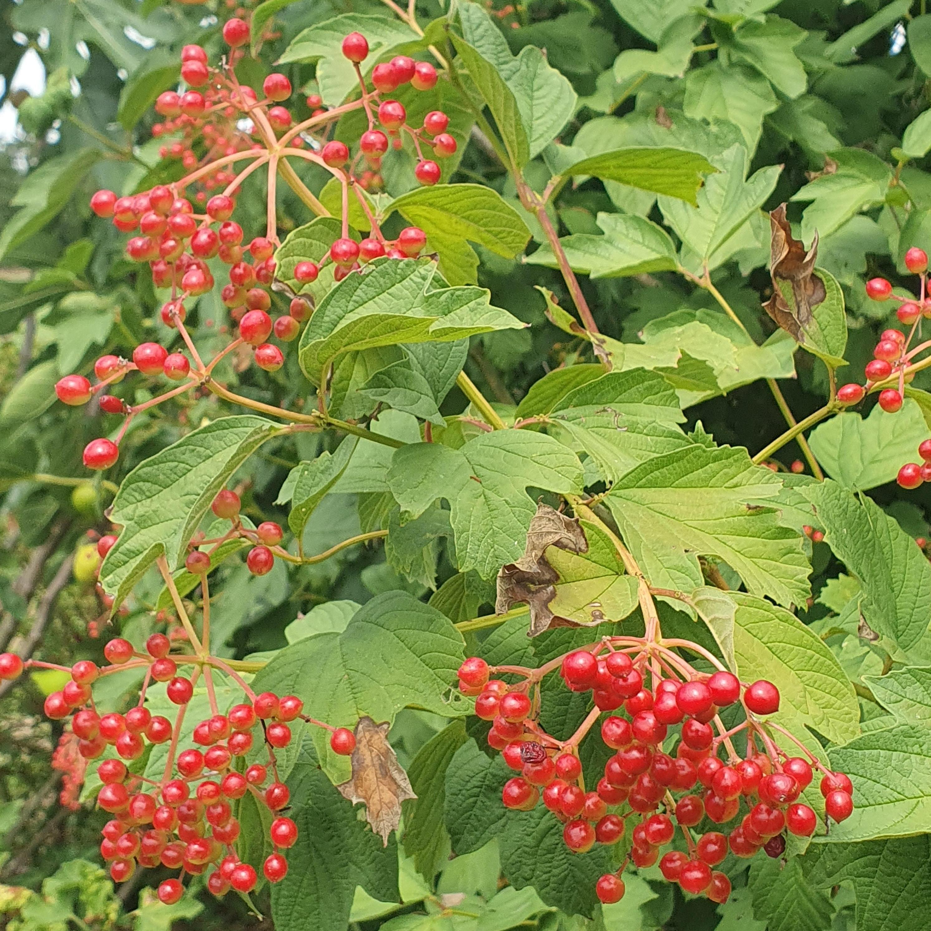 Le Viburnum opulus, également appelé Viorne obier, est un arbuste indigène que l'on trouve dans les sous bois humides, voire jusque dans les marais. Doté d'un port naturellement arrondi, on le reconnait à ses feuilles palmées, ses bouquets aplatis de fleurs blanches suivis de petits fruits rouge vif et ses belles couleurs d'automne. Un arbuste champêtre, coloré, sans prétention, qui s'adapte à toute bonne terre de jardin pas trop sèche.