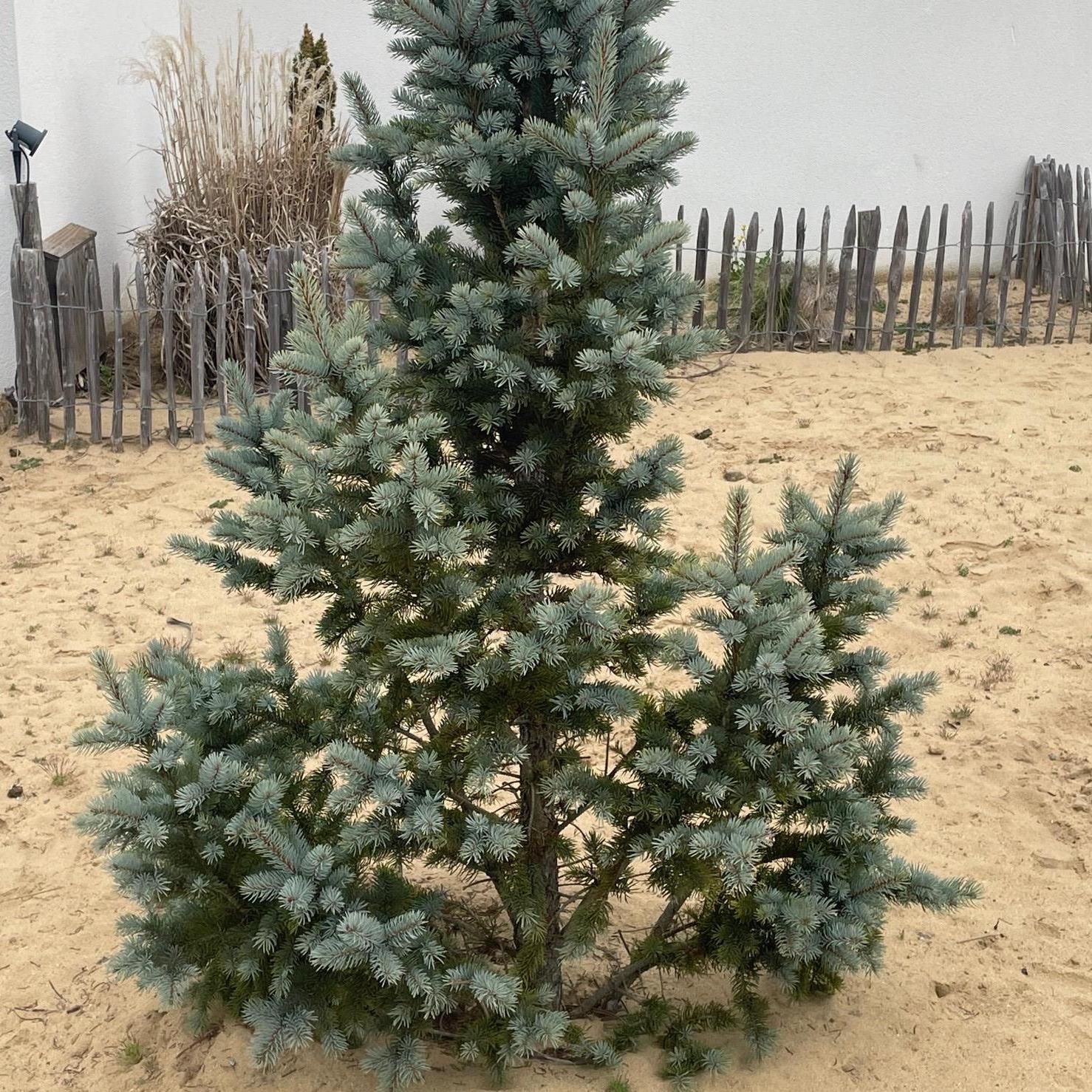 Le Picea pungens 'Iseli Fastigiate' est une forme réduite du Sapin bleu du Colorado qui se développe en cône élancé et régulier, pour former avec le temps un petit arbre plein d'élégance et de caractère. Son feuillage très dense nait bleu au printemps, puis prend une nuance gris-bleu-argenté plus douce, tout en restant très lumineuse. Ses aiguilles sont plus courtes à l'extrémité des rameaux fastigiés, conférant à sa végétation un aspect unique et très graphique. Sa croissance lente et sa taille modeste, sans entretien, lui permettent d'entrer dans un petit jardin, en isolé ou en massif, à l'image d'une sentinelle bienveillante. C'est un magnifique conifère peu exigeant, qui supporte la pollution, la chaleur et une sécheresse ponctuelle une fois bien établi.