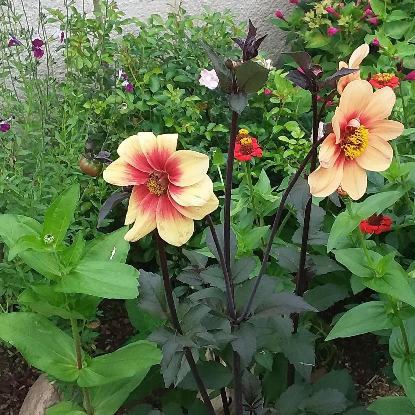 Appartenant à la famille des astéracées, le Dahlia est une vivace à tubercules qui craint le gel et demande à être remisée l'hiver dans la plupart de nos régions. Il apprécie les expositions ensoleillées et préfère les sols riches pour une floraison longue et colorée. Son port érigé et plutôt buissonnant lui confère une place au sein des massifs en compagnie de toutes les estivales. Ses tiges creuses se dressent jusqu'à 60 cm de hauteur et lui confèrent une place au premier plan dans les grands ensembles et en positon intermédiaire dans les plates-bandes de plus petite envergure. La culture en bac lui convient aussi. Les tiges portent des feuilles opposées et composées de trois à cinq folioles subtilement dentées et d'un magnifique pourpre. Au sommet, de belles fleurs se dressent fièrement vers le soleil. Elles constituent des capitules simples, une rangée de ligules larges et obovales s'étalent et dégagent clairement le cœur. Ces ligules possèdent une particularité originale, elles sont bicolores : jaunes sur les deux tiers de la longueur et orange près de la base. Elles encerclent ainsi le cœur aux teintes solaires, d'un beau rouge-brun avec quelques touches de jaune. Cette palette, déjà nuancée, est assez changeante car elle peut se montrer plus ou moins dense. L'ensemble s'épanouit de juillet à septembre et atteint souvent un diamètre de 5 à 7 cm.