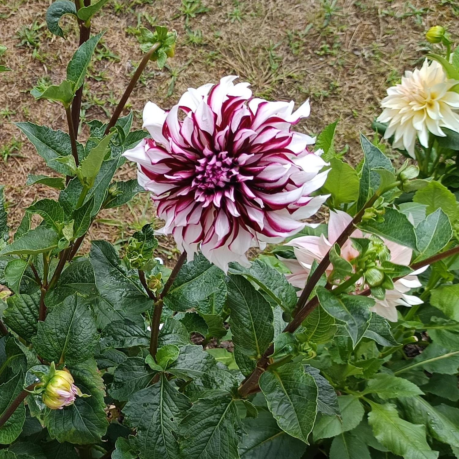 Dahlia décoratif à fleurs géantes grenat et blanc, très beau coloris original. Il sera joliment mis en valeur par un tapis d'asters rouges ou blancs.