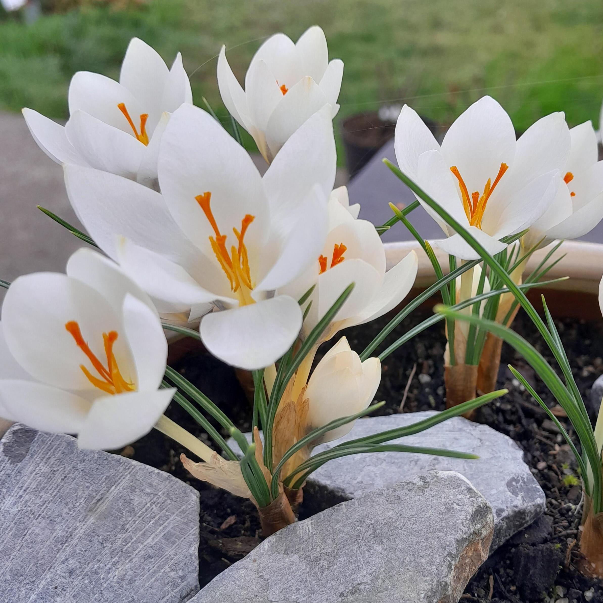 Le Crocus chrysanthus Miss Vain porte des fleurs de coloris blanc pur à peine teinté de bleu fleurit très tôt en saison, perçant parfois la dernière neige. Ses fleurs offrent en plus l'avantage d'être bien parfumées. Facile à cultiver, cette espèce botanique se naturalise facilement dans les massifs ou la rocaille, en sol drainé. Pensez aussi à en faire quelques potées pour votrre terrasse.