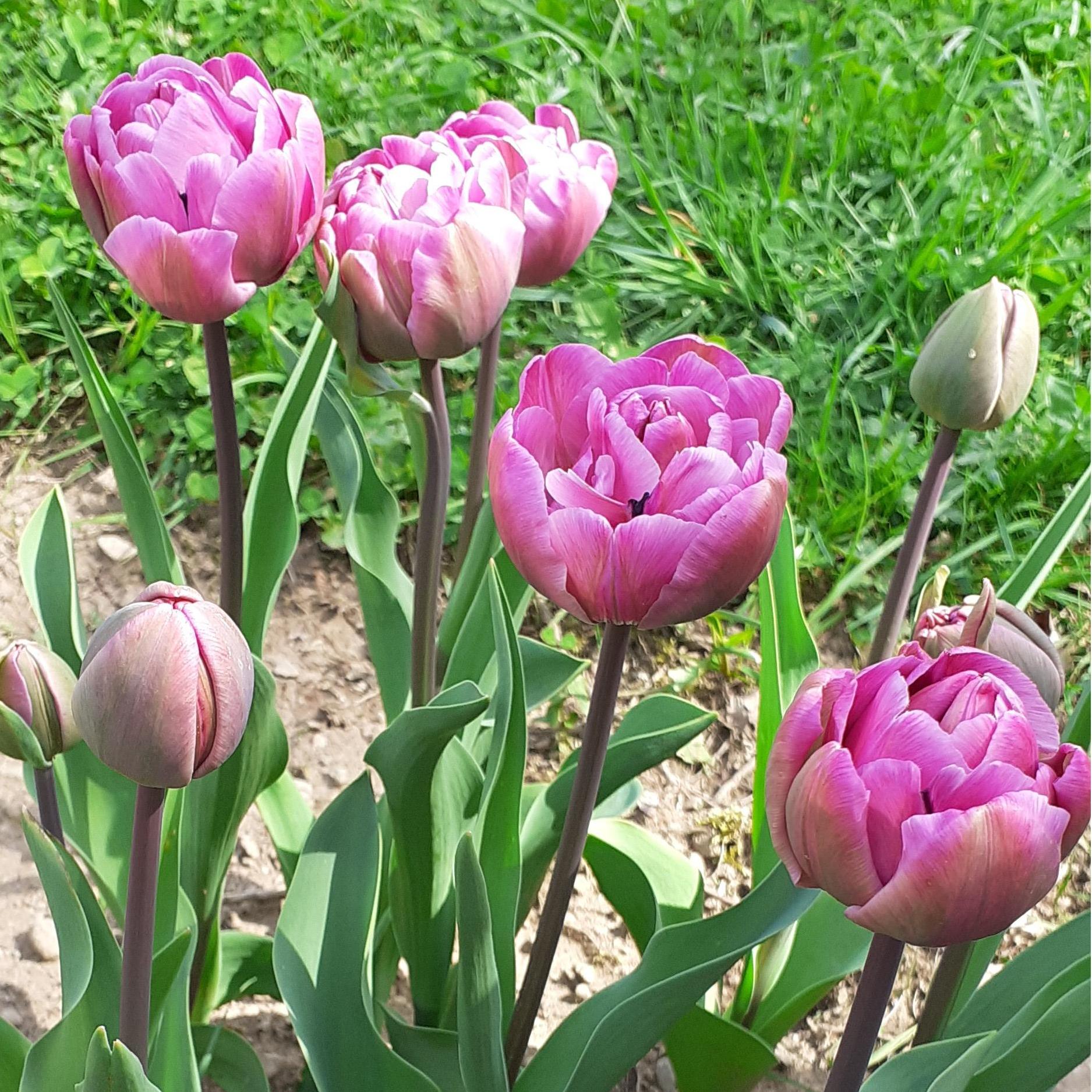 La tulipe Double Tardive 'Diamant Bleu' (Blue Diamond) est une merveille, un vrai bijou pour les massifs printaniers. Sa fleur très double, un peu nonchalante, évoque par son galbe magnifique une pivoine, ou bien une rose. Son coloris, un peu imprévisible, sans doute fonction de la terre qui l'accueille, est un mélange de rose pourpré, de mauve et de lilas, avec parfois quelques fards bleutés. La tige est courte et solide, elle fleurit longtemps, en même temps que les tulipes ‘Angélique’ et ‘Mount Tacoma’, avec lesquelles elle compose une belle aquarelle.