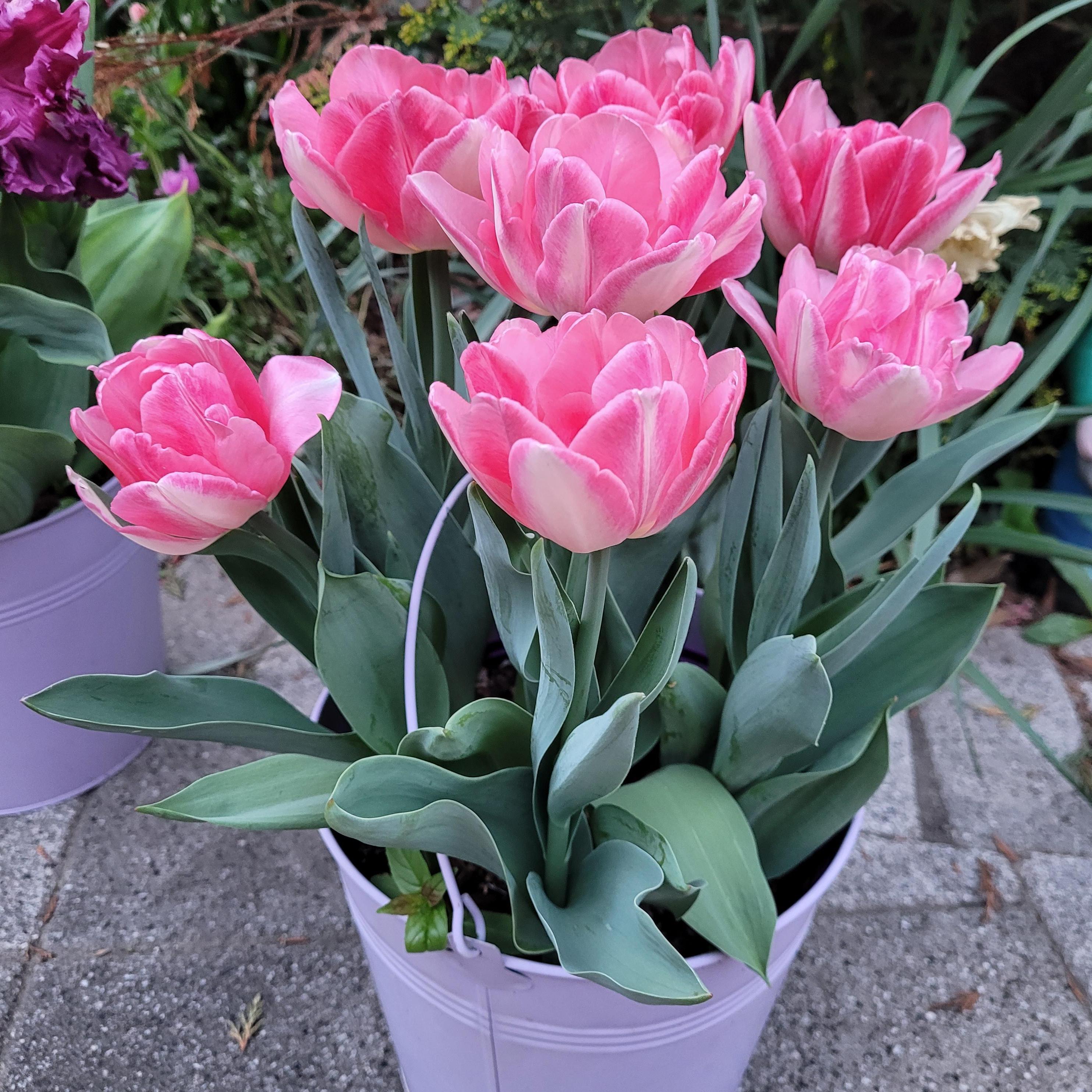 La Tulipe Double Hâtive Columbus forme de très belles fleurs de pivoines, bien doubles, rondes et régulières, composées de pétales rose-violacé pourpré brossés de blanc-rosé en bordure, portées par des tiges relativement courtes et bien solides. La répartition des couleurs est d'un graphisme remarquable. Les fleurs s'épanouissent dès le mois de mars et se renouvellent jusqu'en avril, permettant la réalisation des premiers bouquets de printemps. .