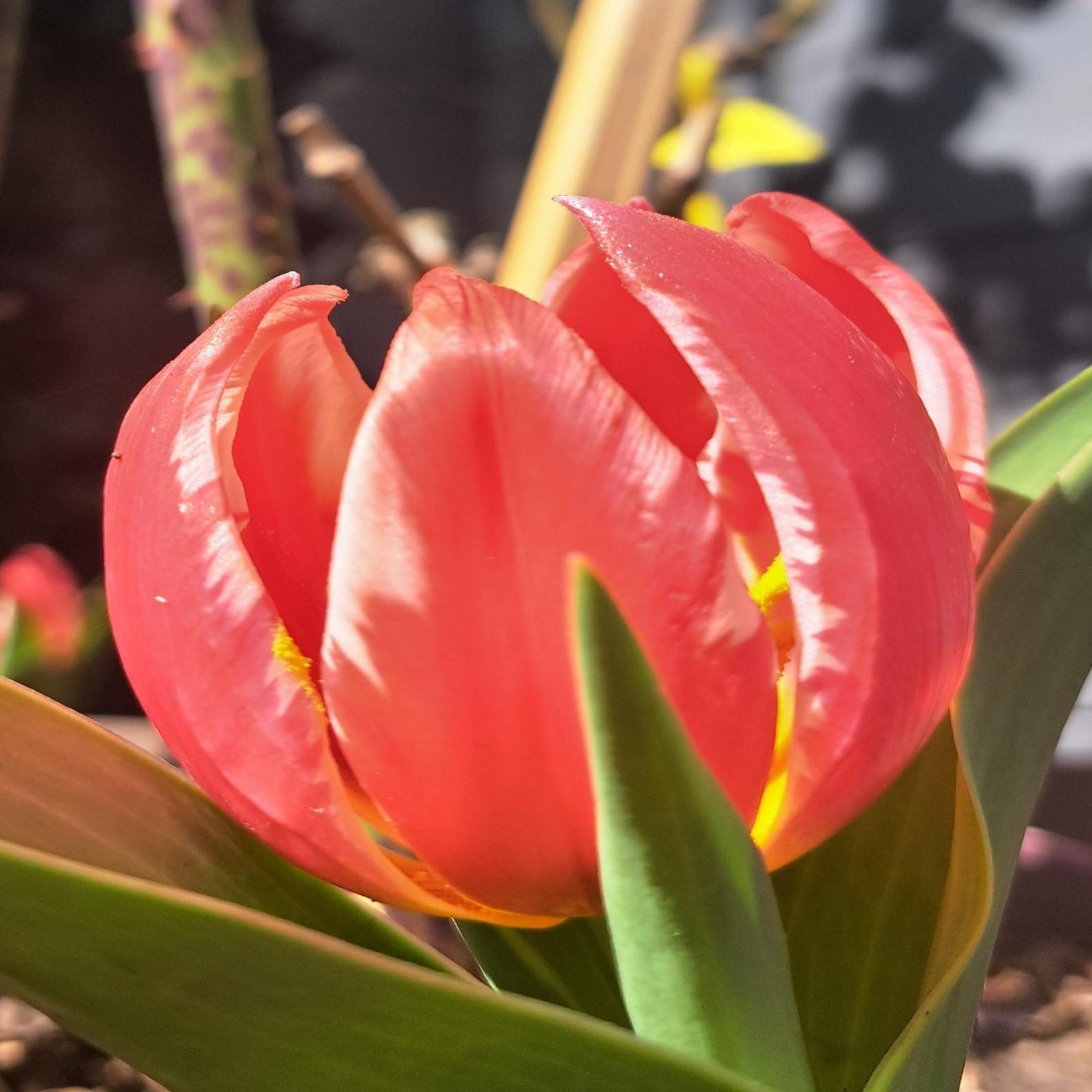 La Tulipe Greigii 'Friendly Fire' appartient à la famille des Liliacées. L'espèce botanique Tulipa greigii est la première que l'on cultiva à partir de bulbes sauvages qui furent ramenés de l'Ouzbékistan en Allemagne, en 1871. Elle est en fait originaire d'Asie Centrale et du nord-est de l'Iran. Cette plante a donné naissance à de nombreux cultivars dont 'Friendly Fire'. Elle ne dépassera pas 15-20 cm de hauteur en fleur. Son feuillage est large, marqué de taches pourpres à brunes sur un fond vert glauque. Les fleurs paraissent en mars, plus ou moins tôt selon le climat. Elles sont d'abord globuleuses, puis s'ouvrent largement sous le soleil. Les pétales sont d'un rouge carmin à rose très foncé, leur bordure est irrégulièrement flammée de blanc. Elles s'épanouissent sous le soleil et se referment quand il se cache. Le feuillage sèche après la floraison, tandis que le bulbe entre en repos.
