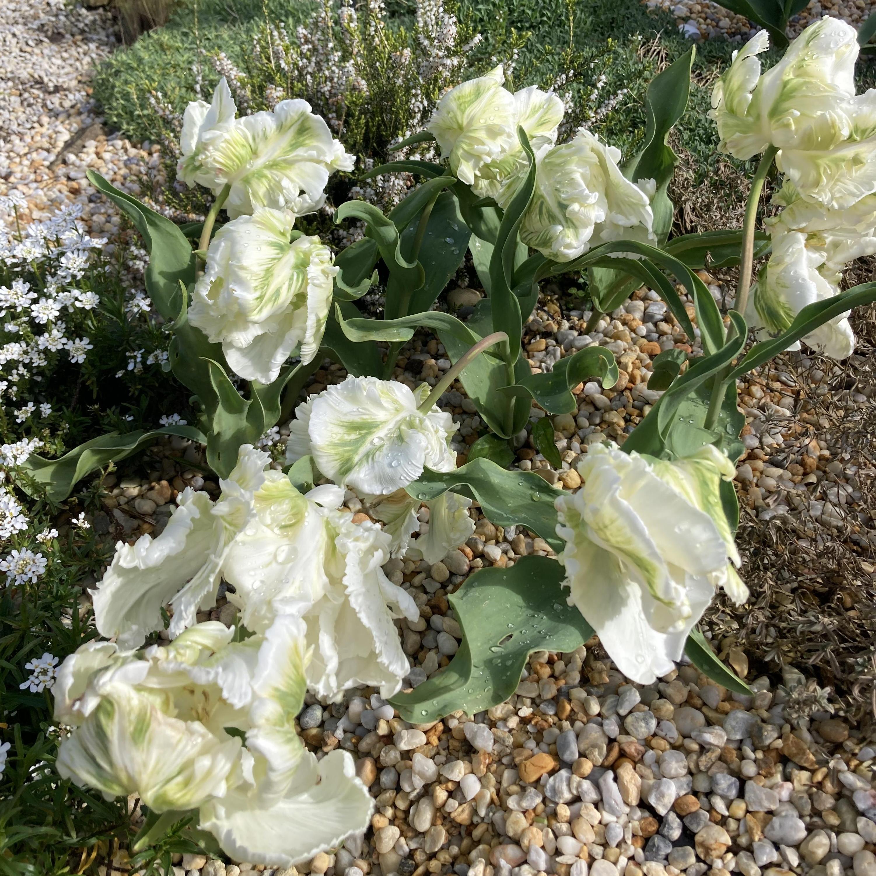 La Tulipe Perroquet Super Parrot est une tulipe très graphique et lumineuse qui offre des pétales blancs flammés de vert. Vous pourrez l’associer avec la tulipe Perroquet Black Parrot pour un contraste étonnant ou avec des tulipes de couleur rose ou pourpré pour jouer les harmonies. Les fleurs énormes se dressent au sommet de tiges souples hautes de 45 cm ce qui les rend particulièrement sensibles aux intempéries. Perchée sur les tiges bien au-dessus des feuilles largement lancéolées, les fleurs sont toutes différentes mais ont en commun le coloris blanc et vert des pétales. Elle fleurit au cœur du printemps à partir d’Avril.