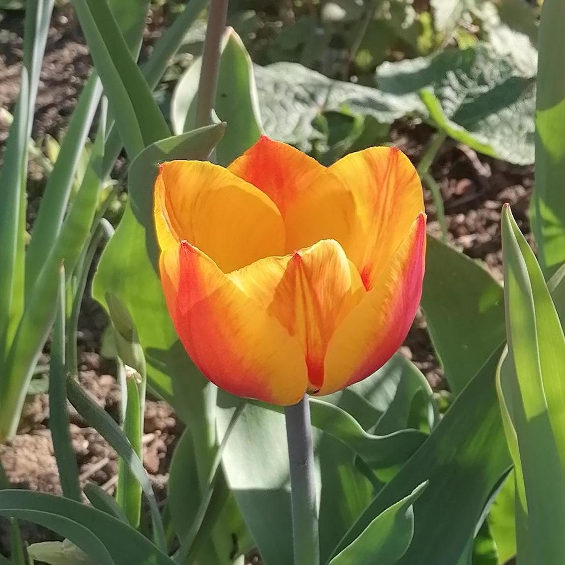 La Tulipe 'Flair' appartient à la famille des Liliacées. D'origine horticole, obtenue en 1978 aux Pays-Bas, on la classe actuellement dans la Division 1 des tulipes, dont la principale caractéristique est de fleurir tôt en saison. De taille modeste, elle atteindra 30 à 35 cm de hauteur en fleur. Perchées sur les tiges épaisses émergeant à peine des feuilles largement lancéolées, les fleurs en coupe large et aux reflets brillants dévoilent un intérieur jaune d'or, marqué de petits signaux orange à la base des pétales qui encerclent un petit coeur noir à étamines jaunes. La floraison se déroule en mars ou au début du mois d'avril selon le climat, en même temps ou juste après celle des tulipes botaniques greigii. Cette variété se pérennise bien au jardin.