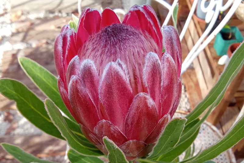 Les Protea, originaires d'Afrique du Sud, sont considérés comme des plantes délicates, à cause de leur très faible rusticité. Bien sûr, je le protège en hiver, l'emmitouflant et le surveillant comme le lait sur le feu. Je ne l'arrose également que d'eau de pluie à température ambiante et lui ai offert comme il se doit un substrat acide et léger. Pas sûr que je le plante au jardin avant encore quelques années, auquel cas il faudra lui trouver un endroit particulièrement protégé. La venue de ces grosses fleurs duveteuses est un tel spectacle que je le recommande à tous les jardiniers et jardinières épris d'exotisme, cette plante me transportant littéralement ailleurs !