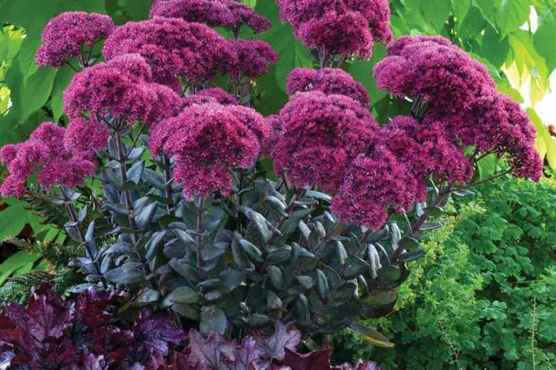 Le Sedum ‘Thunderhead’ fait partie des bonnes surprises. Cette variété a littéralement balayé mes préjugés sur les sedums, grâce à sa présence et à sa vigueur. Dès le printemps, ses tiges robustes et sombres se dressent fièrement, portant un feuillage vert bleuté très charnu. Mais, c'est à la fin de l'été que la magie opère : les têtes florales, denses et énormes, s'épanouissent dans un rose rouge pourpré très profond, et perdurent jusqu'au début de l'hiver. Comme ces fleurs, perchées sur des tiges pourpres, sont très mellifères et nectarifères, elles attirent des nuées de pollinisateurs.