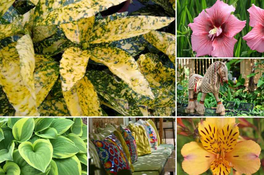 Hosta 'The King', Hakonechloa macra et un Aucuba japonica 'Crotonifolia' pour leurs feuillages dorés et panachés (l'Aucuba vous gratifiera de jolies baies rouges quelques mois plus tôt) en compagnie des fleurs toniques de l'Hibiscus syriacus 'Hibisa rosada', et du lys des incas 'Duc d'Anjou'.