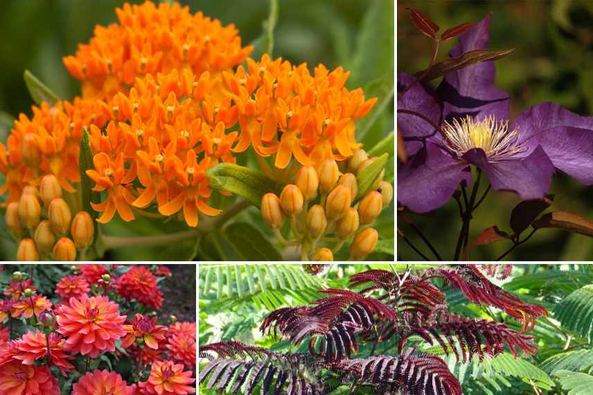L'ambiance bohème se pare de couleurs vives, profondes et chamarrées qui se répondent, mais aussi d'associations de tonalités chaudes dans les floraisons : des rouges intenses, des violets profonds, des roses indien et des orangés épicés, sans oublier les bicolores. Les feuillages bleutés, dorés ou pourpres contribuent à renforcer cette ambiance délurée, en apportant des taches rouges ou bien panachées.
