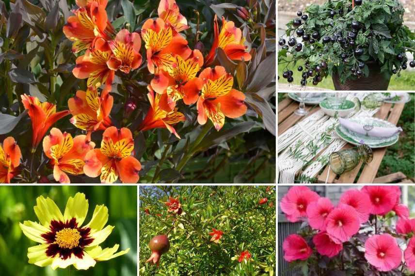 Des alstromères 'Indian Summer', orangés et jaunes contrastant sur leur feuillage bronze, feront très bel effet en compagnie de Coreopsis 'Cosmic Eye', d'un jaune lumineux, ponctué de pourpre, ou de la jolie variété toute jaune 'Full Moon Madness'. Rajoutons quelques autres longues floraisons comme celles d'un hibiscus des marais 'Pink Passion' aux fleurs géantes et feuillage pourpre foncé, et encore un peu de feuillage, avec la présence d'un grenadier cultivable en pot, comme le Punica granatum 'Nana', dont la floraison éclatante s'accordera à merveille avec les autres plantes vivaces. Pour picorer à l'heure de l'apéro, conviez par exemple des tomates cocktail étonnantes 'Akoya', dont les fruits deviennent noirs.