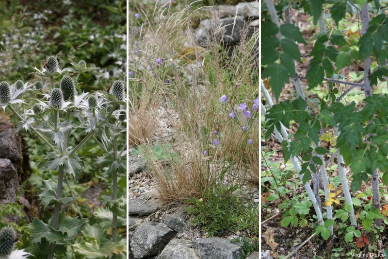 On y découvre un serpent fait de pierres, c'est le domaine des chardons et autres plantes piquantes, mais aussi des alliums. Les panicauts géants et les ronces d’ornement à la tige épineuse blanche ne passent pas inaperçus. Je fais connaissance avec cette plante, la Morinia longifolia, une vivace himalayenne peu courante qui forme de belles hampes florales en petites couronnes étagées et des feuilles dentées.