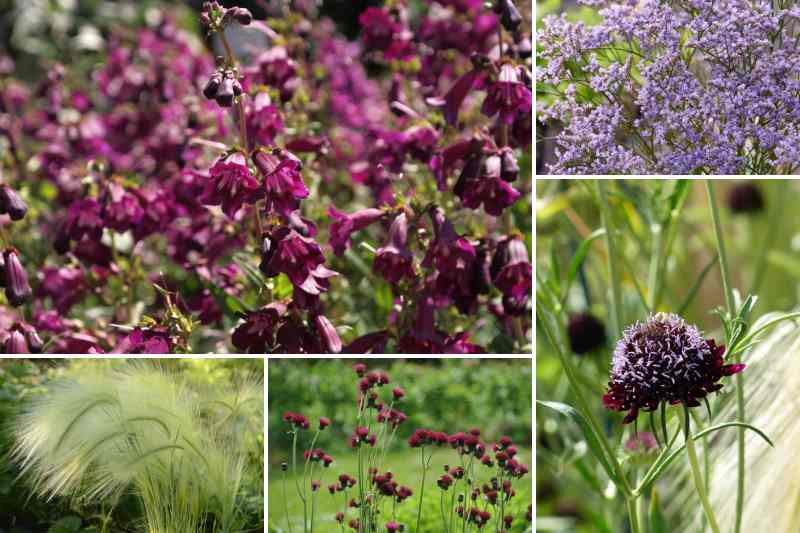 Dans le sens des aiguilles d'une montre : Penstemon 'Raven', statice, Scabiosa 'Chile Black', Cirsium rivulare 'Atropurpureum' et Hordeum jubatum