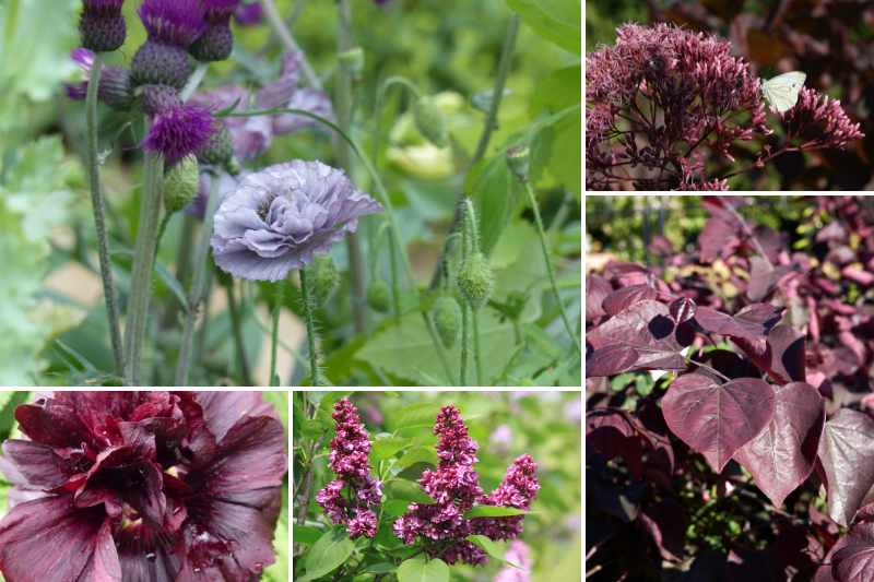 Autour de deux beaux arbustes choisis, l'un pour sa floraison lie-de-vin à fleurs doubles, le lilas 'Charles Joly', l'autre pour son feuillage remarquable en forme de cœur, le Cercis canadensis 'Forest Pansy', conviez quelques vivaces dans les mêmes tons très chauds, et des feuillages grisés pour la douceur. Dans notre exemple, la légèreté des inflorescences d'une eupatoire pourpre côtoie le subtil gris lavande d'un coquelicot très raffiné (Papaver rhoeas 'Amazing Grey'), et la verticalité toute gracieuse de roses trémières à fleurs doubles 'Chater's Violet'.