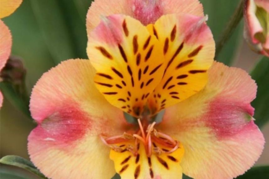 Dotée d’un doux parfum, rare chez les Alstroemères, l’Alstroemeria ‘Sweet Laura’ embaume d’une légère senteur épicée, proche de celle des œillets. Originales, ses fleurs très légères se déclinent en tons jaune d’or tacheté de brun pourpre, orange brûlé et acajou, avec des étamines acajou. Les feuilles sont d’un vert franc satiné. Prolifique et vigoureux, ce Lis des Incas est doté d’un port compact et dense, il atteint 70 cm de hauteur et 50 cm de large. De juin-juillet à fin septembre, les petites fleurs de 4 cm se renouvellent joyeusement. La plante est rustique en zone USDA 8a, autour de -12 °C.