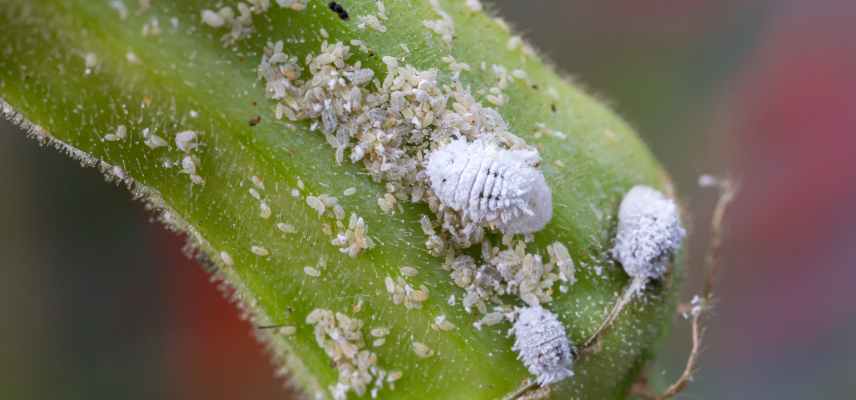Leur nom nous donne un indice sur leur physique : les cochenilles farineuses sont recouvertes d’une substance blanche et cotonneuse, voire granuleuse. Elles sont visibles à l’œil nu et s’installent, comme les pucerons, le long des tiges, en dessous ou à la base des feuilles.