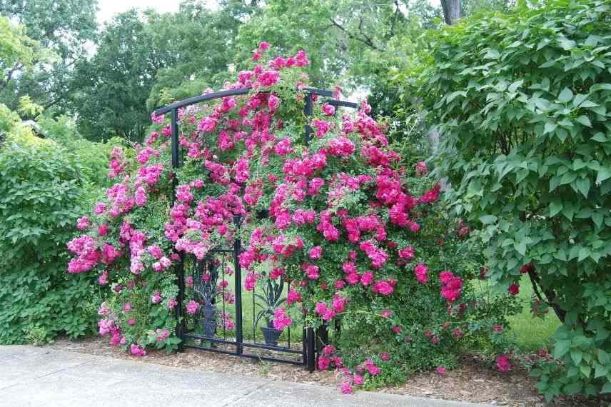 Les classiques et indémodables rosiers à fleurs roses sont très présents chez les grimpants.