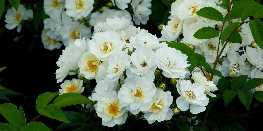 ‘Seagull’ est un rosier liane qui offre au printemps de grands bouquets de fleurs blanches aux étamines jaunes dorées. Les fleurs sont semi-doubles et libèrent un léger parfum. Elles sont abondantes et recouvrent joliment le feuillage. C’est une variété très précoce, pouvant fleurir dès le mois de mai. Il porte des feuilles vert clair et offre en automne des cynorrhodons rouges. N’hésitez pas à l’installer au pied d’un arbre et à le faire grimper sur celui-ci !