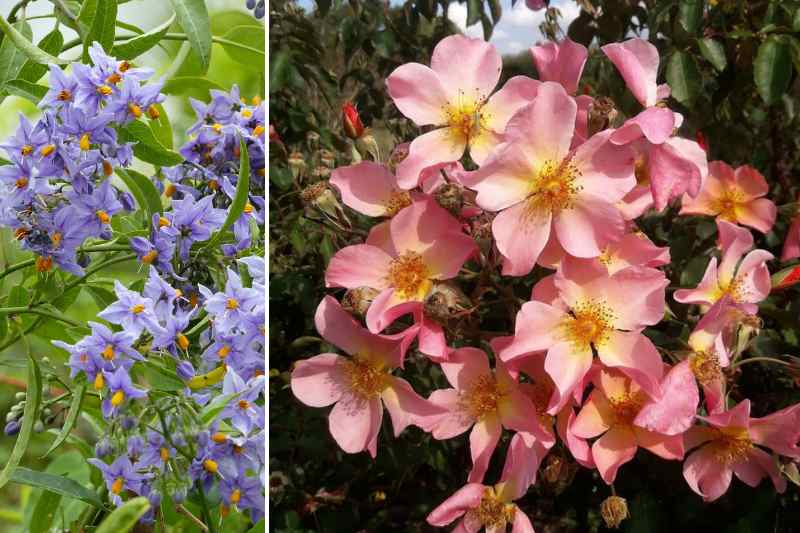 Le rosier 'Lens Flair' est idéal pour habiller une pergola, une belle arche, une clôture ou un grand treillage. Pour changer des associations classiques avec une clématite, pourquoi ne pas planter ce très beau rosier en duo avec une autre belle grimpante comme ici un solanum bleu, ou pour rester dans un dégradé de camaïeux, un jasmin 'Clotted Cream', ou encore avec le rosier 'Coraline' ou 'Colette' qui séduisent par leurs teintes abricotées ? Tous fleuriront en même temps que le rosier Flair.