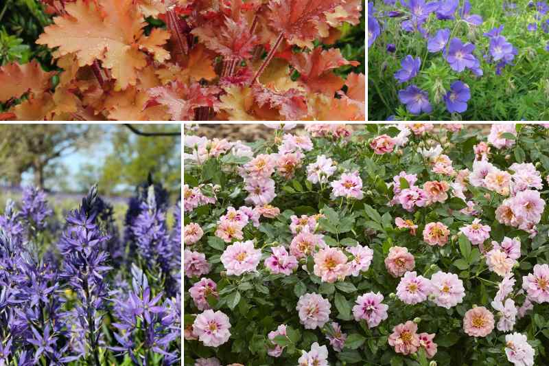 Pour l'accompagner, profitons de la générosité d'un Géranium vivace 'Orion' bleu violacé, s'étalant largement en couvre-sol ou retombant en potée, de quelques plantes à bulbe comme le Camassia 'Blue Melody', d'une heuchère 'Flower Power' à floraison légère rose vif et au feuillage vert, ou 'Marmelade' dont le feuillage bronze doré et rose provoquera une douce harmonie avec les roses.