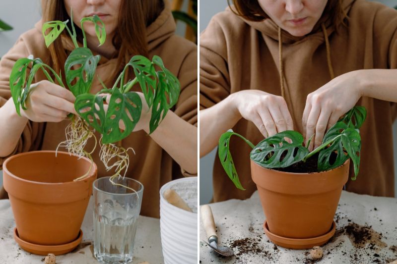 5- Installer la bouture de Monstera dans un pot avec du terreau pour plantes vertes, allégé avec une poignée de perlite ou de pouzzolane.