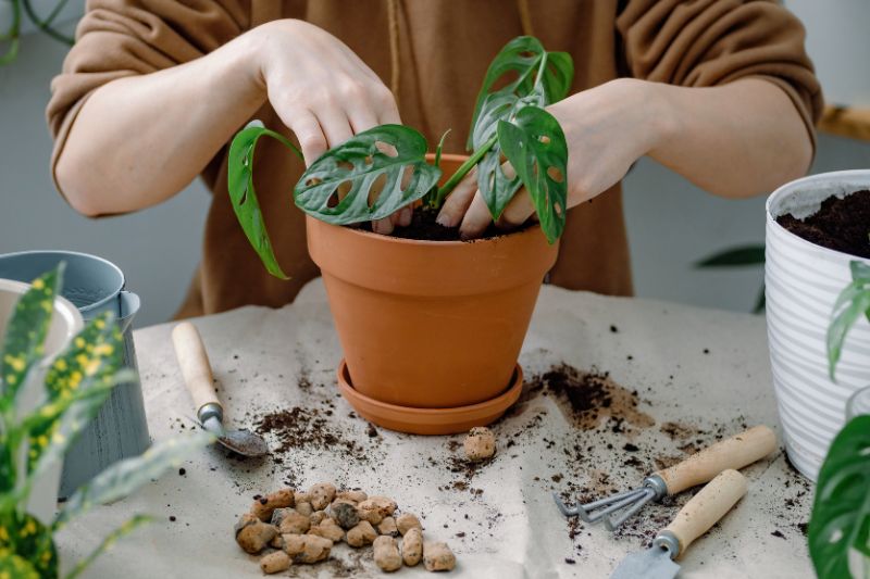 5- Installer la bouture de Monstera dans un pot avec du terreau pour plantes vertes, allégé avec une poignée de perlite ou de pouzzolane.