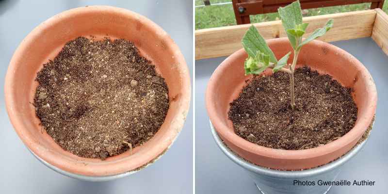 - Préparez le(s) pot(s) : remplissez le(s) avec du terreau pour semis jusqu'à 2 cm du bord du pot, puis tassez le substrat avec les mains ;