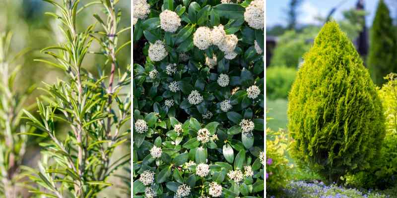 Il s'agit surtout d'arbustes à feuillage persistant et de conifères comme le thuya, certaines aromatiques ligneuses, en particulier le thym et le romarin. Parmi les arbustes concernés : skimmia, cotoneaster, escallonia, gaulthérie, et fusains, mais aussi la vigne (Vitis), le sumac, les prunus, le Cotinus, le Weigela, la glycine et les clématites, l'olivier, etc.