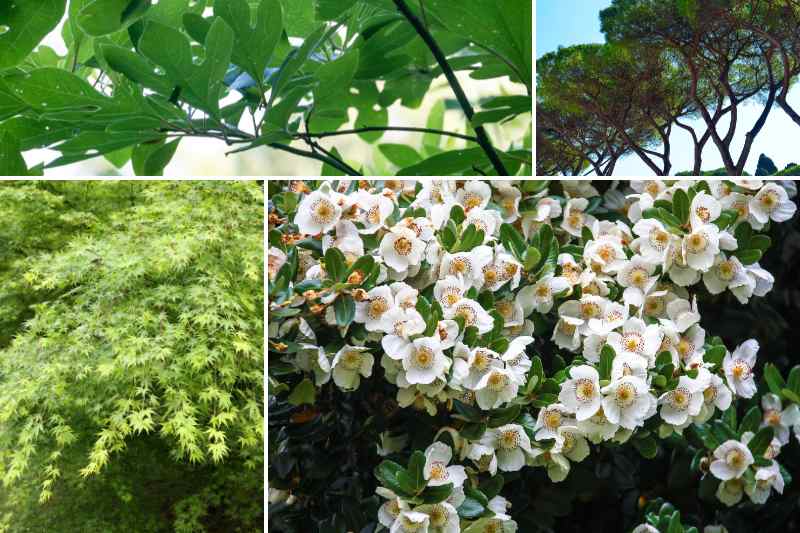 Parmi les arbres populaires ayant ces exigences, on retrouve de nombreux érables, des conifères avec les pins (pin de Corse, pin sylvestre et pin maritime en particulier), Tsuga et beaucoup de magnolias, sans compter les châtaigniers, les saules et quelques chênes (chêne-liège) et hêtres, ainsi que le Sassafras albidum.