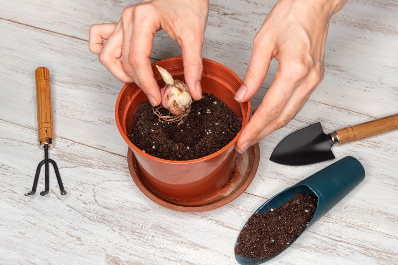 Bon à savoir : plantez 3 bulbes dans un pot de 30 cm et 5 à 7 bulbes dans un pot de 40-50 cm. - Recouvrez les bulbes avec 10-15 cm de substrat, tasser légèrement.