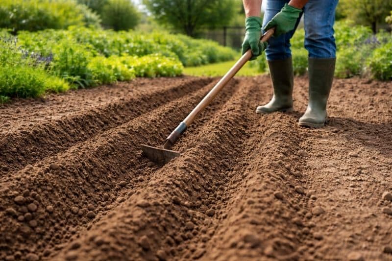 1- Tracez des sillons de 10 à 15 cm de profondeur, espacés de 60 à 70 cm.