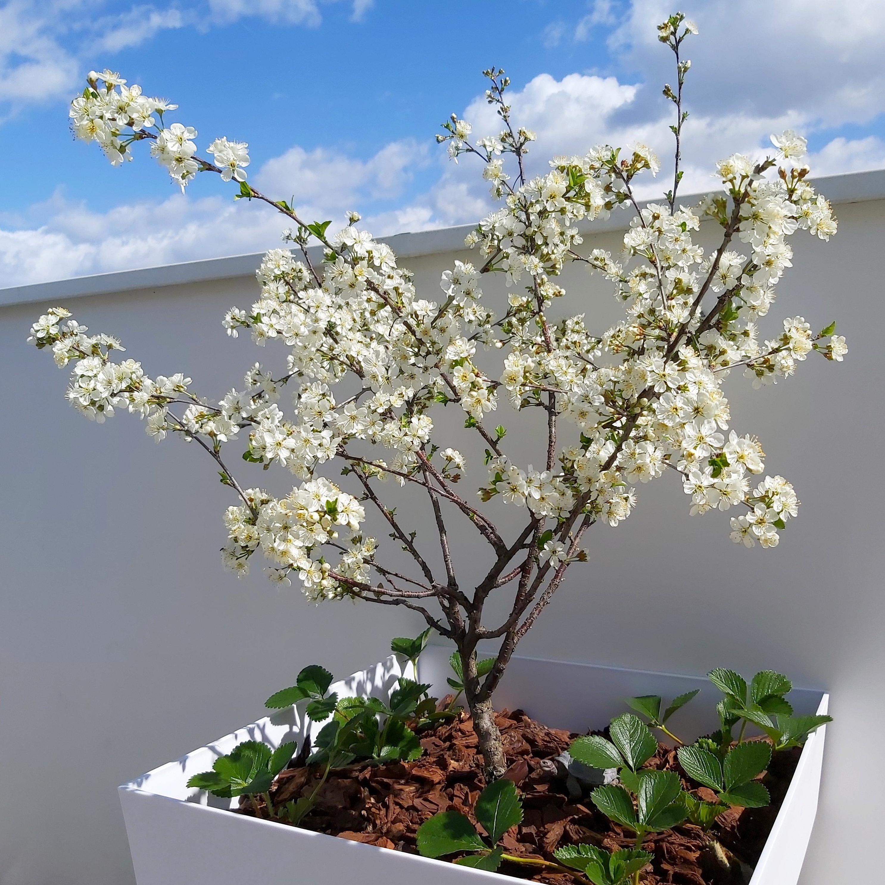 En culture depuis 2018, je vais me résigner à l'arracher... Dommage, c'est vrai que l'arbre est vraiment nain. Mais les rameaux, couverts de très fleurs au printemps, ont encore une fois terminés majoritairement desséchés, attaqués par la brûlure bactérienne. Et le peu de cerises qui murissent sont aigrelettes; moins bonnes que celles de mon griottier...