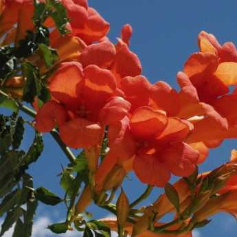 La floraison a lieu de mai-juin à septembre. Les fleurs s'épanouissent à l'extrémité des pousses de l'année et à l'aisselle des feuilles, regroupées en grappes ramifiées. Elles ont la forme de trompettes largement évasées, longues et larges de 6-8 cm. Chacune est composée d'un tube s'évasant en 5 lobes arrondis et ondulés. Leur couleur est un joli rose frais, rehaussé par une gorge d'un rose un peu plus foncé. Cette floraison, très légèrement parfumée, est nectarifère et mellifère, très visitée par les abeilles et les bourdons. Le feuillage persiste en hiver, en climat approprié. Il est composé de feuilles découpées en 5-7 grandes folioles ovales à lancéolées, d'un vert clair et lustré, à bords lisses. En cas de gelée, toutes les parties aériennes de la plante sont détruites. Mais elle repartira de la souche, tardivement au printemps.