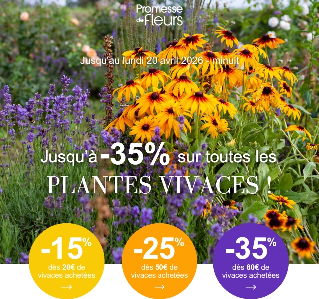 20€ de vivaces achetées -15% sur l'ensemble des vivaces 50€ de vivaces achetées -25% sur l'ensemble des vivaces 80€ de vivaces achetées -35% sur l'ensemble des vivaces