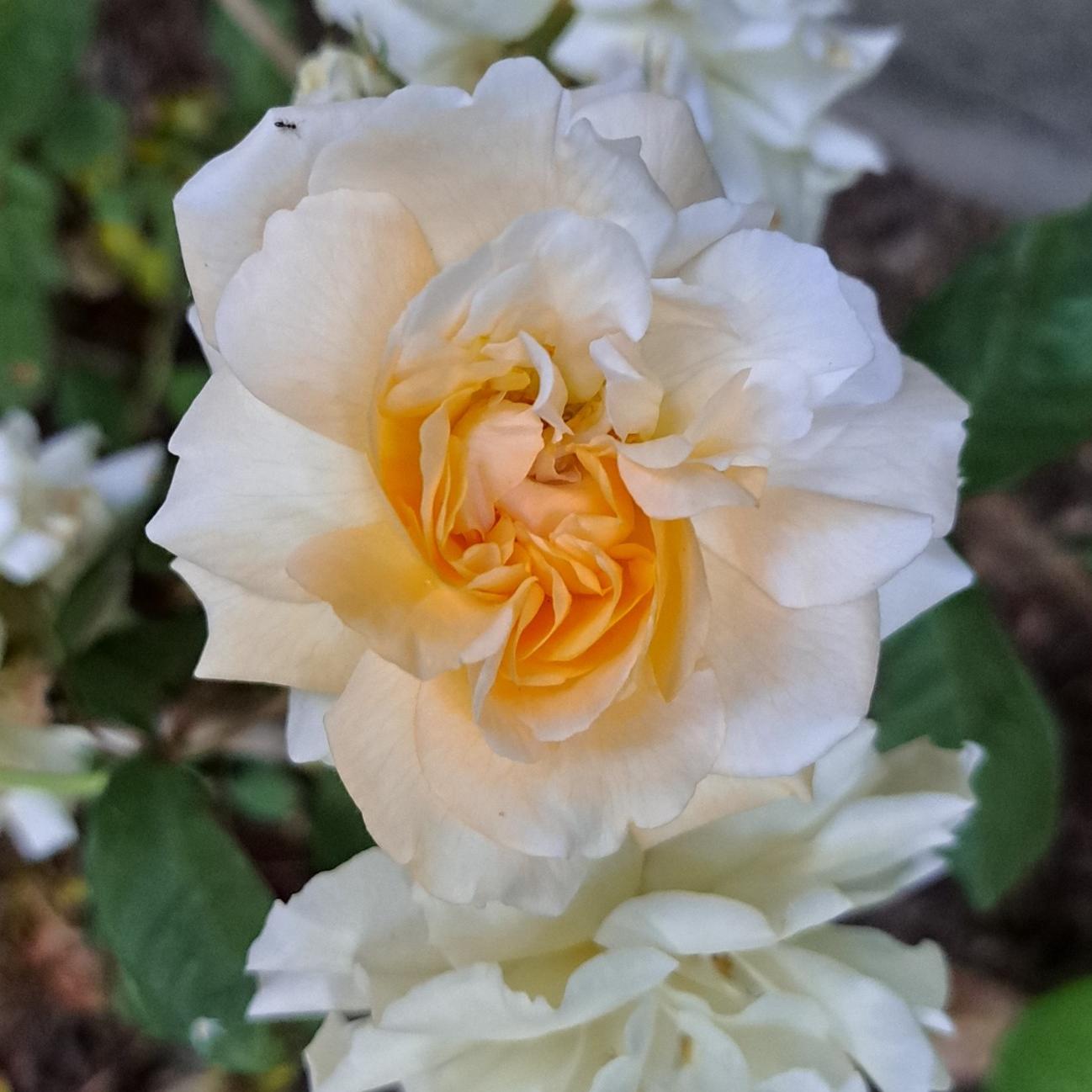 Le Rosa (x) moschata 'Buff Beauty' n'est pas à proprement parler un rosier ancien, puisque sa création par Bentall est ultérieure à 1867. Néanmoins, il en a toutes les caractéristiques, et demeure encore aujourd'hui, en raison de ses multiples atouts, peu égalé. On retrouve dans sa généalogie la contribution du Rosier musqué (Rosa moschata), via le Rosier noisette 'William Allen Richardson', très remontant et très parfumé. Cette variété forme un buisson au port souple, étalé, haut et large de 1 m 50 environ, parfois davantage selon les conditions de culture. Sa floraison longue et régulière a lieu de juin à septembre. Ses roses, larges de 7 à 8 cm, sont composées de plusieurs rangées de pétales réguliers, dentelés, bien organisés, ne laissant apparaître que tardivement le coeur jaune d'or de la corolle. La couleur dominante est un jaune abricot doux, fardé de chamois et d'orangé au centre. A la défloraison, elles forment sur la ramure un vaporeux nuage de corolles blanc-crème. Le feuillage, semi-persistant, vert foncé, dans l'ensemble très sain, est particulièrement foisonnant.