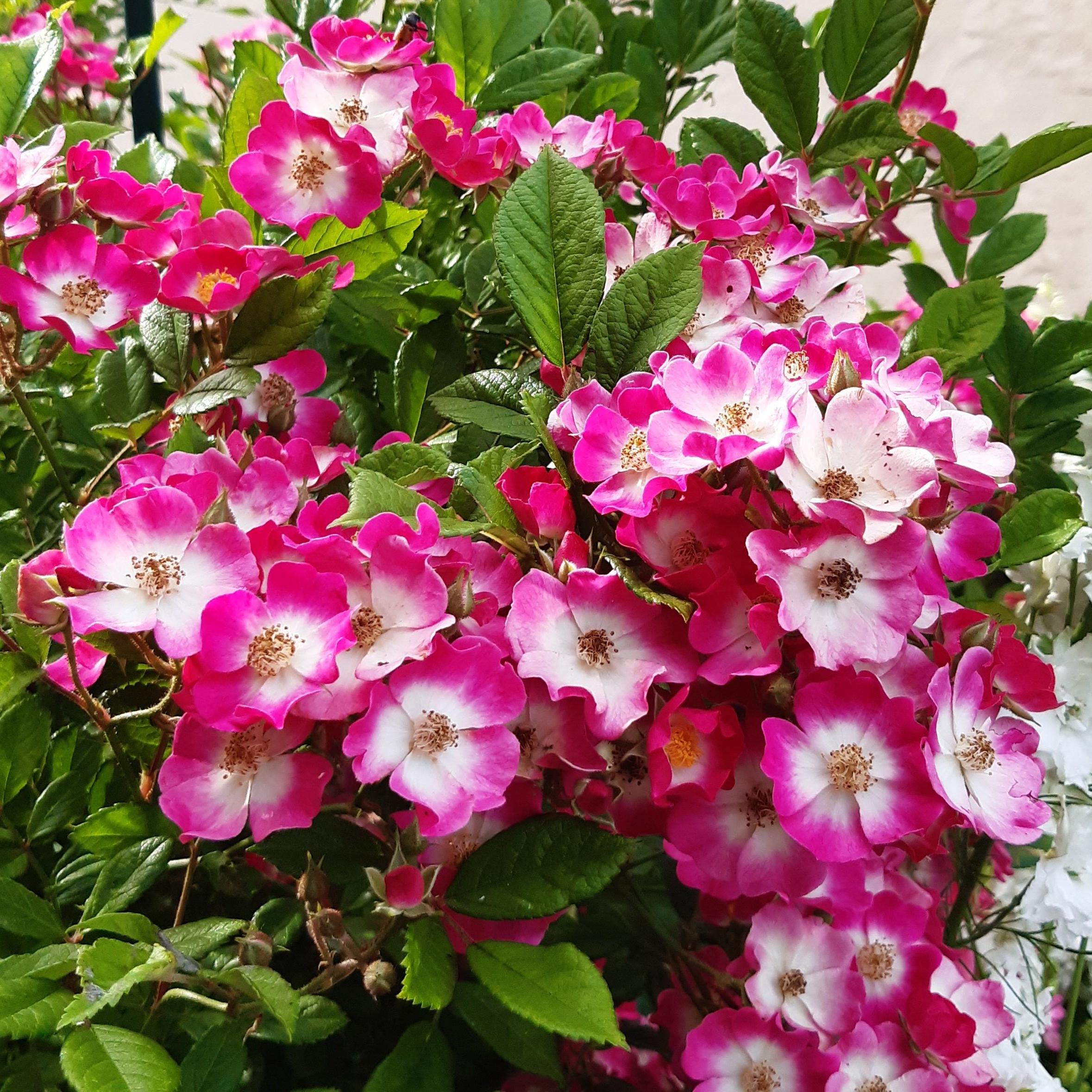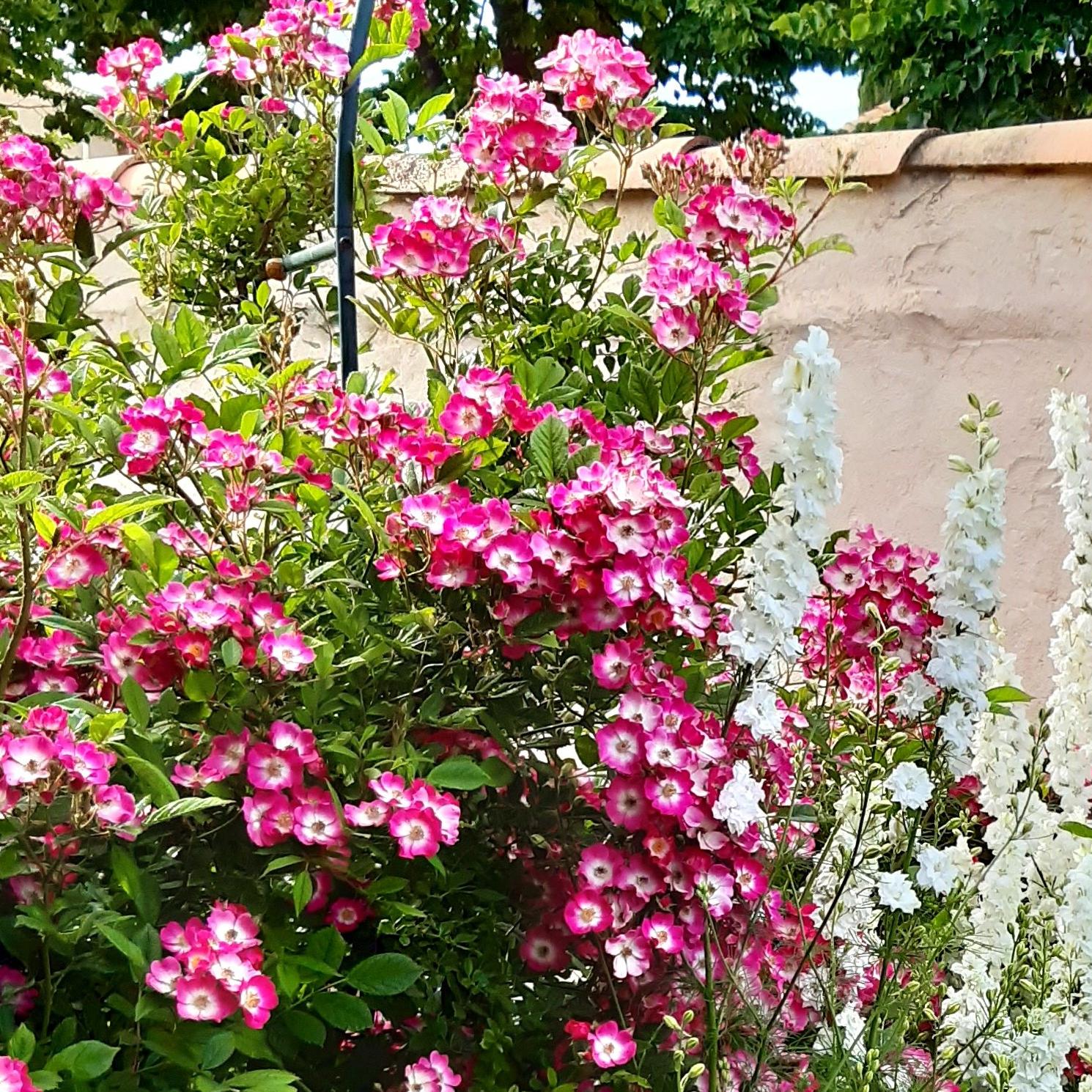 J’adore le rosier Mozart. Il est fourni et costaud, il tient bien le froid et la pluie. Il est couvert par vagues de myriades de petites fleurs légères, rose vif. Il se marie très bien aux grosses roses, son rendu est aussi excellent en bouquet champêtre avec d’autres roses.