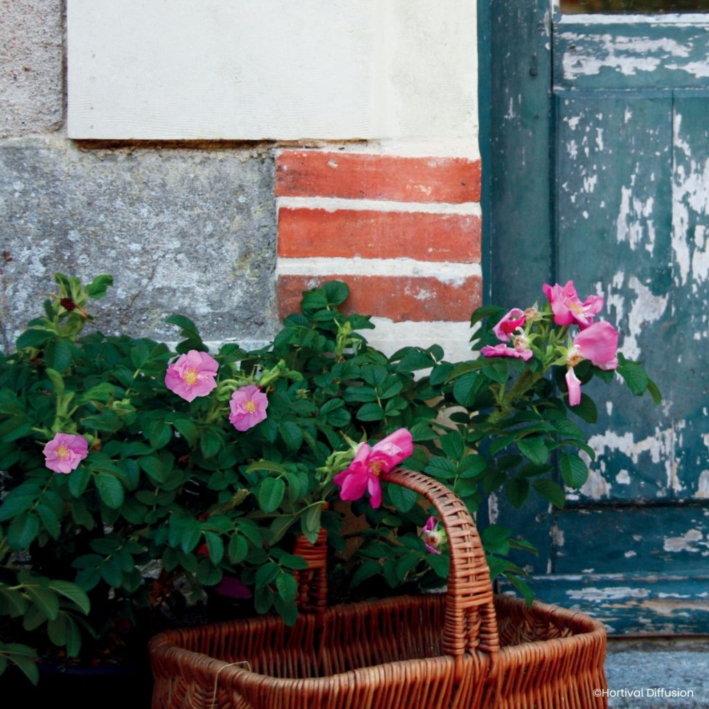La floraison, semi-double à double, s’étend de juin à septembre, parfois jusqu’en octobre. Ses fleurs roses sont regroupées en petits bouquets. Chaque corolle mesure 6 à 8 cm de diamètre et s’ouvre sur de nombreuses étamines jaunes, libérant un parfum délicat, typiquement rugosa : frais, floral et discret, mais bien présent. Les feuilles sont caduques en hiver. Chacune est composée de folioles ovales, coriaces, gaufrées, d’un vert vif et brillant. En automne, elles prennent des teintes dorées et orangées avant de tomber. En fin d’été, des cynorrhodons rouge vif, décoratifs et durables, apparaissent et persistent jusqu’à l’hiver.