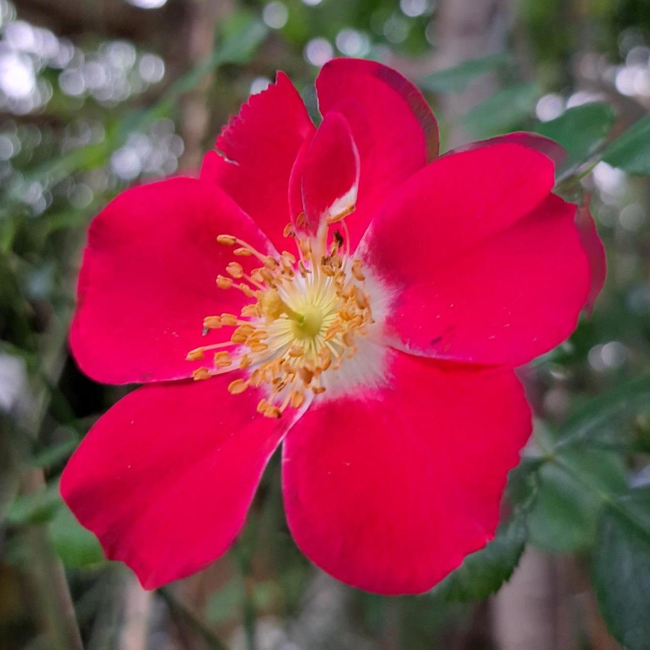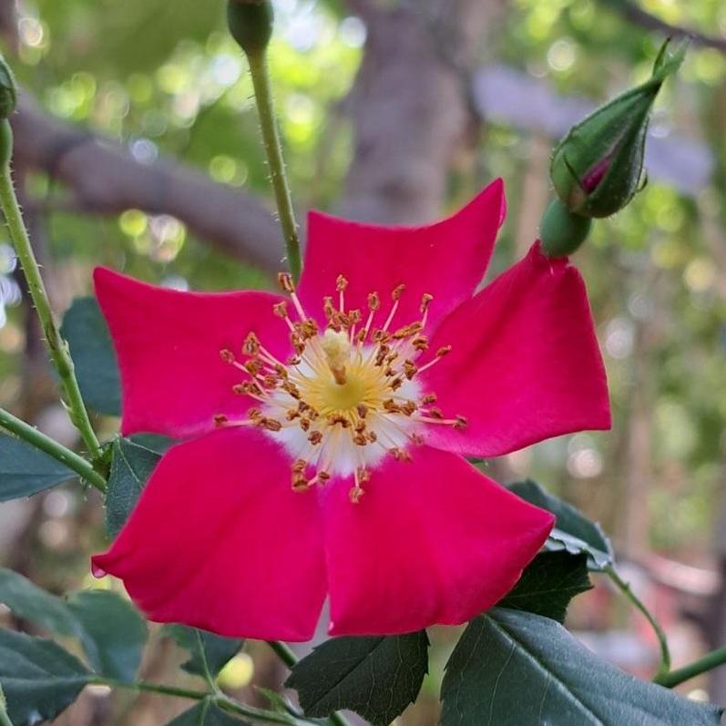 Appartenant à la famille des Rosacées, le Rosier Candia Meillandecor®, aussi nommé Rosier Candia Meidiland, est une variété hybride moderne développée pour offrir une floraison prolongée et un port couvrant efficace. Il forme un buisson large et dense, atteignant 60 à 80 cm de hauteur pour 80 à 100 cm de largeur, ce qui en fait une plante idéale pour les aménagements paysagers nécessitant une végétation étendue et peu contraignante. Ses tiges souples et ramifiées, à croissance rapide, supportent des inflorescences en bouquets de plusieurs fleurs, offrant une floraison généreuse par vagues successives tout au long de la saison. Les fleurs simples, d’un rouge éclatant au cœur doré, et revers plus clair, sont particulièrement attractives pour les pollinisateurs et créent un contraste saisissant avec le feuillage vert foncé lustré. Les étamines dorées bien visibles ajoutent une touche lumineuse à la floraison et renforcent l’effet naturel et champêtre de ce rosier. À l’approche de l’automne, il produit une multitude de petits cynorrhodons orangés, qui persistent jusqu’en hiver, offrant une valeur ornementale supplémentaire et une ressource précieuse pour la faune locale. Son feuillage caduc, épais et brillant, résiste remarquablement bien aux maladies courantes des rosiers, notamment au marsonia et à l’oïdium, sans nécessiter de traitements spécifiques.