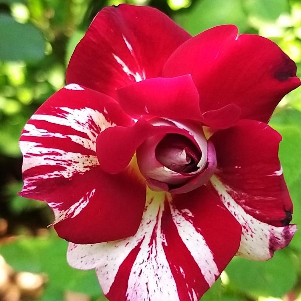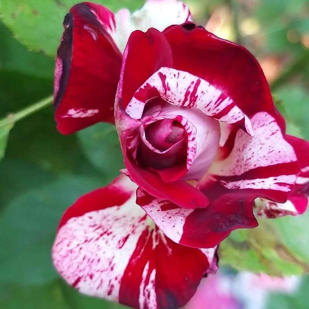 Cette variété hybride fait partie de la famille des hybrides de thé ou rosiers à grandes fleurs. Avec une croissance rapide, elle forme une plante à la végétation dense, au port compact, pouvant atteindre 0.70 à 0.80 m de hauteur et 0.50 à 0.60 m d’envergure. Cet arbuste se caractérise par des branches solides et épineuses qui supportent un feuillage dense découpé en larges feuilles dentelées d'un vert foncé satiné, ajoutant ainsi une belle allure ornementale à la plante. De mai-juin à octobre, elle offre une floraison généreuse et continue. Les boutons floraux d'un ton violacé s'épanouissent en de superbes fleurs de 10 à 11 cm de diamètre, composé de 40 à 50 pétales, qui rappellent la forme caractéristique des hybrides de thé. Pour maintenir une floraison continue, il est recommandé de supprimer régulièrement les fleurs fanées. Ses fleurs sont groupées souvent par 2, 3, voire 5 à l'extrémité d'une longue et solide tige épineuse idéale pour la fleur coupée. Les pétales dont la couleur dominante est le rouge magenta sont plus ou moins mouchetés et rayés de blanc crème. Les roses diffusent un parfum intense aux notes exotiques d'agrumes et de Verveine de Madagascar.