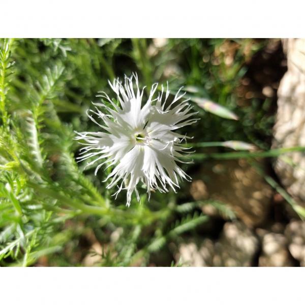 Rustique jusqu'à -17°C, ce petit œillet, à port compact et dense de 25cm de hauteur, développe un feuillage persistant, linéaire, de 4cm de long, vert. En juillet, des fleurs, solitaires sont formées d'un tube court et de 5 pétales, frangés blancs, légèrement odorants. Il forme un beau coussin très florifère jusqu'en septembre.