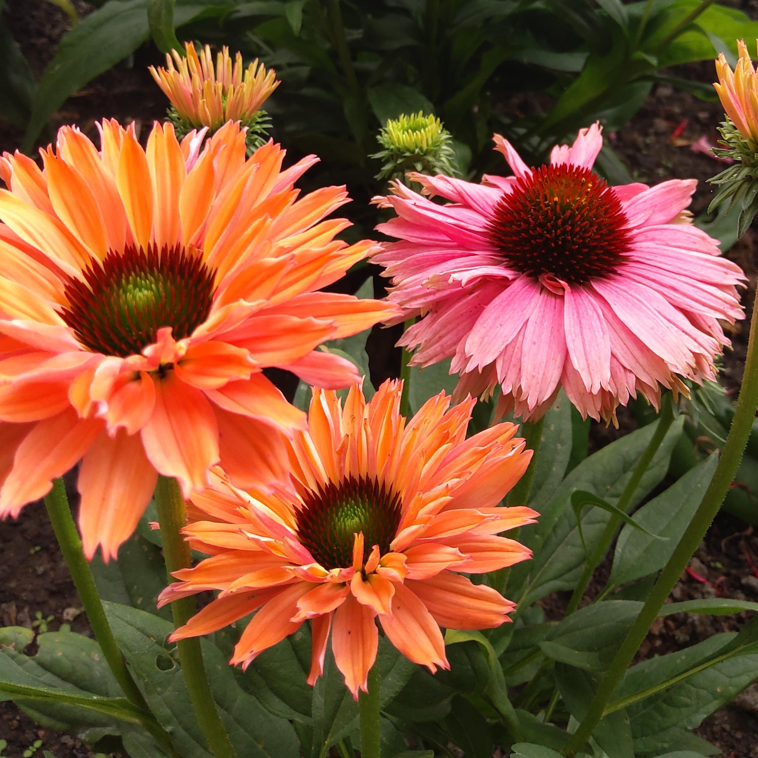 L'Echinacea SunSeekers 'Rainbow' enthousiasme les amoureux des couleurs douces et changeantes. Ses grandes fleurs touffues éclosent en jaune clair avant de rapidement évoluer en un camaïeu de roses : corail, lavande, saumon, rose poudré. En plein été, toutes ses couleurs sont présentes en même temps sur la plante. Les fleurs ont un cône central brun entouré de nombreux pétales superposés. Compacte et florifère, cette variété est excellente en bordures, au premier plan des massifs, en pots et en fleur coupée. Facile à associer à toutes les autres plantes du jardin ou de la terrasse, ses fleurs attirent de nombreux insectes butineurs.
