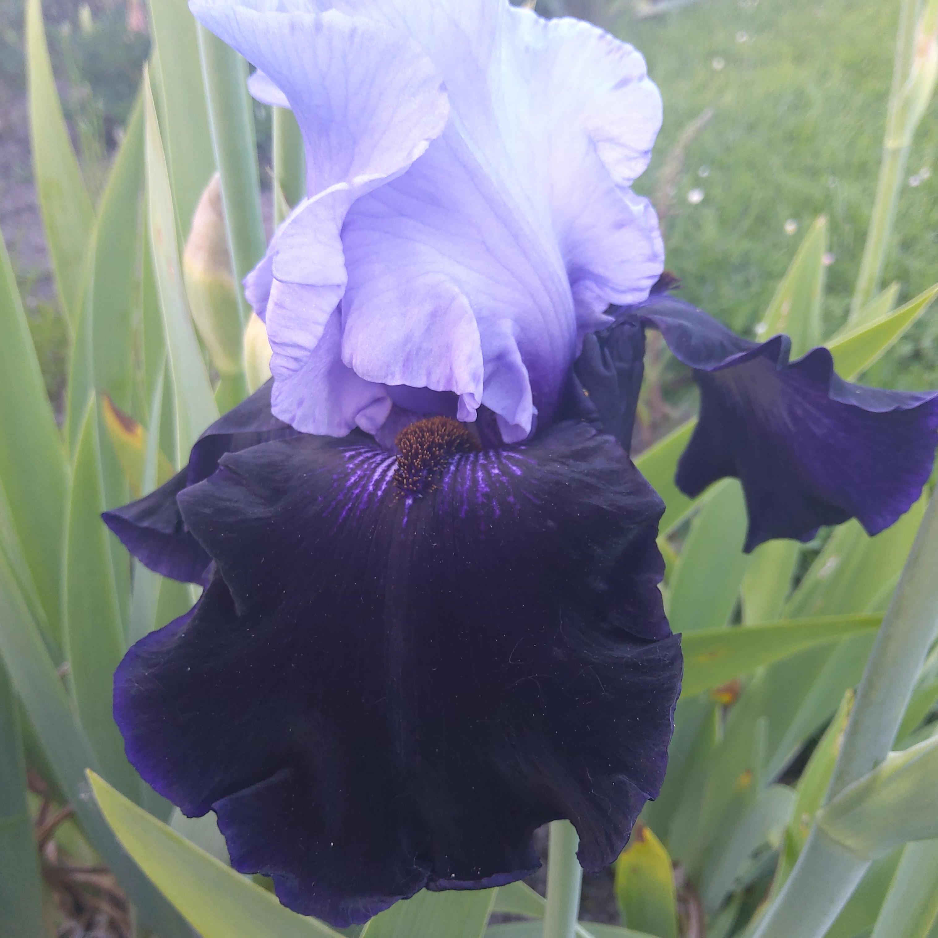 L'Iris germanica 'Dangerous Mood' se distingue par sa multiplication rapide et la production de tiges robustes. Les sépales arborent un bleu velours profond avec une texture ébouriffée, tandis que les trois pétales dressés, appelés étendards, sont d'un blanc pur teinté de bleu indigo. Les barbes de cet iris sont noir pourpré avec des pointes jaunes. Cette variété se développe rapidement en formant de superbes touffes qui fleurissent au printemps, apportant de l’éclat sur plusieurs semaines aux massifs, aux jardins de rocaille ou aux plates-bandes fleuries.