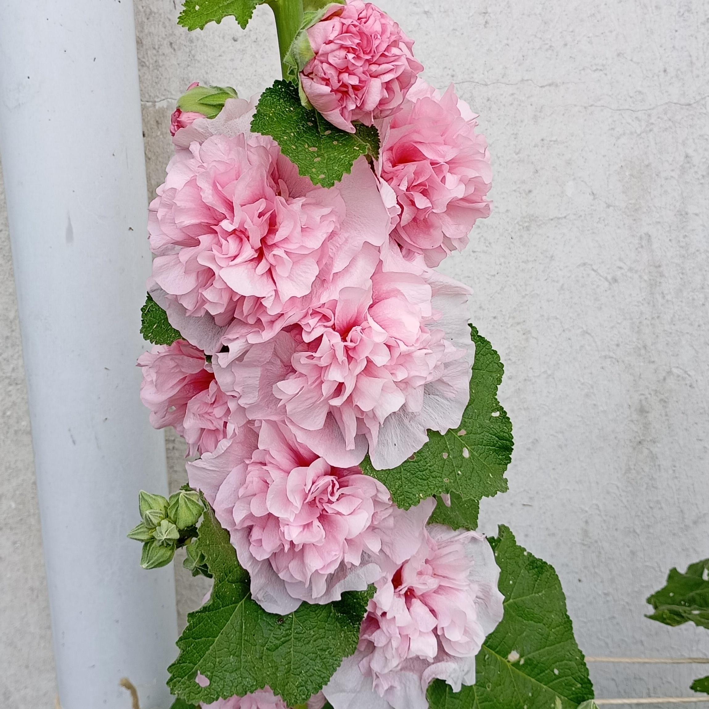 La rose trémière est aussi connue sous le nom latin d'Althaea rosea, et ses noms vernaculaires adoptent tous les accents de nos régions: elle s'appelle ainsi Passe-rose, Rose à bâton, Rose papale ou primerose. De la famille des malvacées, elle est originaire d'Asie mineure et souvent naturalisée dans les jardins naturels, les friches, les tas de terre. 'Chater's Double Rose' est une variété à fleurs très doubles issue de cette sauvageonne. Il s'agit d'une plante dressée, généralement non ramifiée, qui peut atteindre 2m à 2.5m de hauteur. Elle forme une rosette de feuilles arrondies à 5 ou 7 lobes, d'où émerge une hampe florale robuste, dont la croissance est très rapide. Ces inflorescences en épis se couvrent de gros boutons qui s'épanouissent, de façon échelonnée de juin à août, et du bas vers le haut, en grandes fleurs à corolles très doubles dont la texture reflète merveilleusement la lumière. Elles arborent une teinte rose moyen franc, et sont tendrement serrées les unes contre les autres sur la flèche. Durant toute cette période elles attireront les abeilles et les papillons dans votre jardin. La floraison laisse place à de nombreux fruits garnis de graines qui se ressèment spontanément dans les zones les plus inattendues, qu'elle choisit elle-même: au pied des murs, dans les sols pauvres et caillouteux, les anfractuosités des murs, etc...
