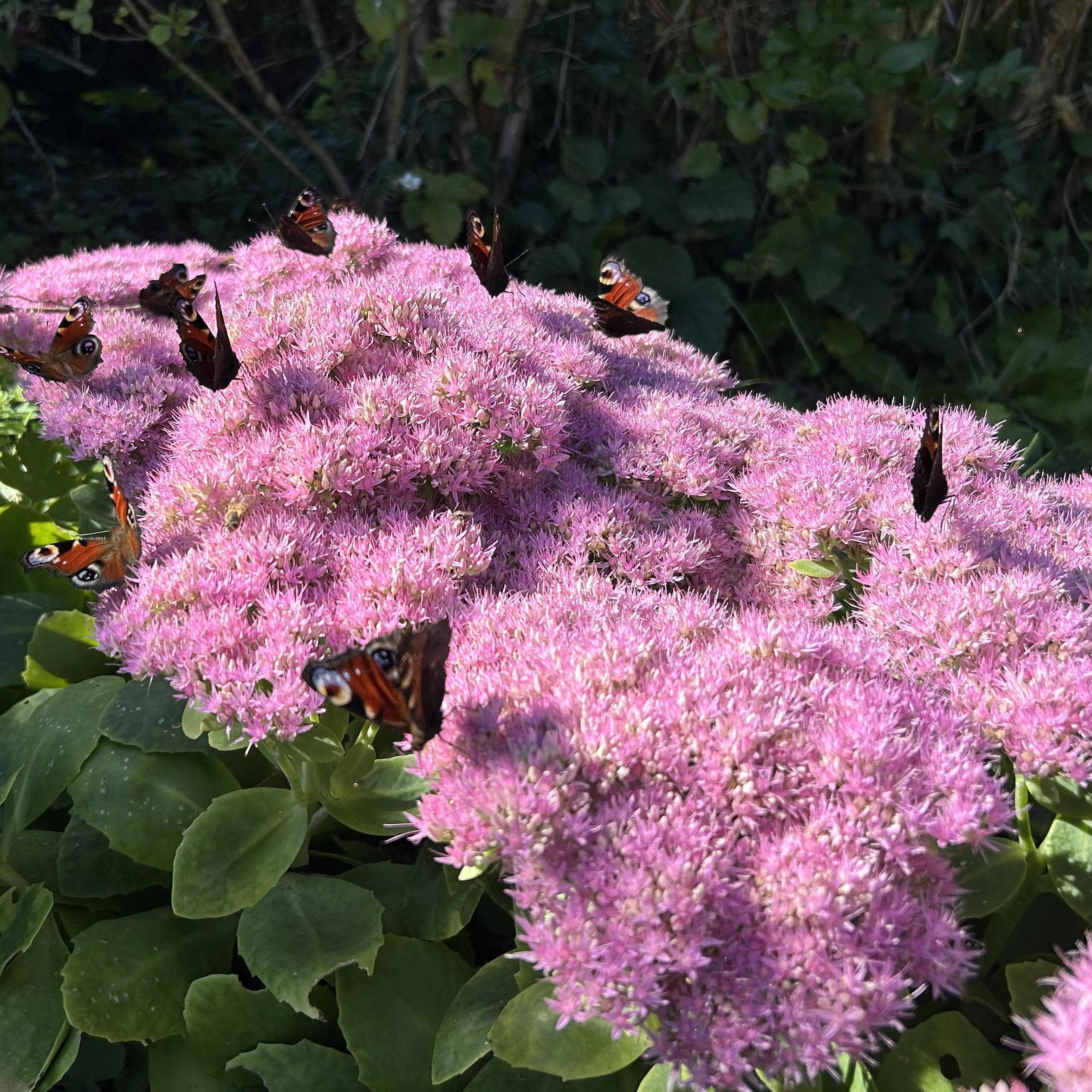 Le Sedum spectabile 'Septemberglut', également appelé Orpin d'automne est une vivace succulente à racines charnues, montrant de la fin de l'été à l'automne et jusqu'aux gelées de grandes inflorescences aplaties rose framboise où se pressent les papillons. C'est une plante sans souci, adaptée aux terrains secs, qui demande très peu d'entretien et donne beaucoup de charme à l'arrière saison.