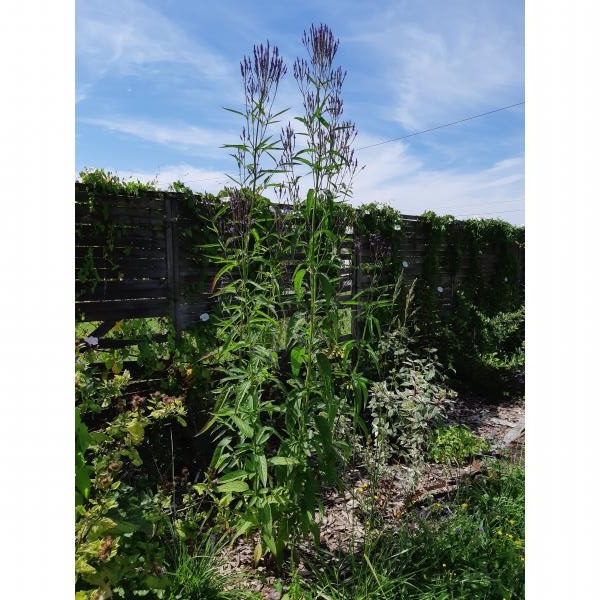 La Verbena hastata connue aussi sous le nom de verveine hastée, est une grande vivace bien rustique a adopter les yeux fermés. Elle se distingue par une floraison exceptionnellement longue, dressée en candélabres fins et ramifiés, formés d'épis très droits, densément couverts de petites fleurs violettes. Les insectes butineurs s'y pressent dés le levé du jour. Le feuillage est vert vif, composé de feuilles très allongées et dentées. Cette plante a quelque chose d'enchanteur, alliant floribondité, graphisme et facilité de culture. Elle réussit partout, en tout sol ordinaire et drainé, humide, frais ou ponctuellement sec, au soleil, et se ressème facilement au jardin.